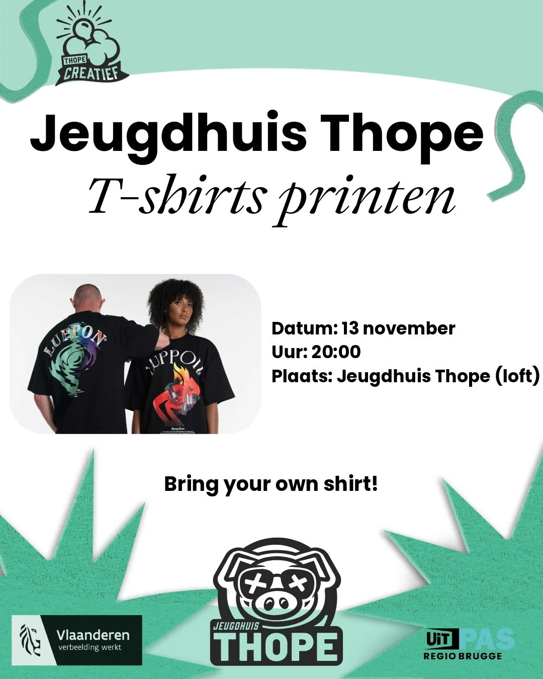 Op Donderdag 13 november nodigen we je uit in Jeugdhuis Thope (Loft) voor een supercoole en creatieve avond: onze T-Shirt Design Workshop! 💥